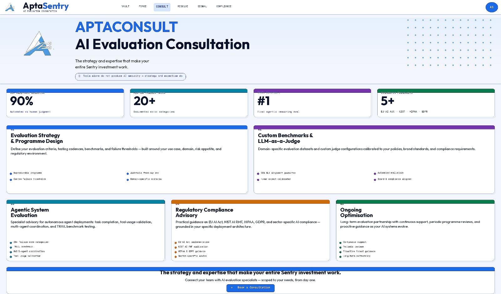 The strategy and expertise that make your entire Sentry investment work. Tools alone do not produce AI security. Without a clear evaluation strategy, calibrated benchmarks, and an expert-designed programme, even the most capable platform produces findings that teams struggle to act on. Many organizations have the technology. What they lack is the evaluation maturity to extract full value from it — and the regulatory expertise to translate findings into defensible compliance posture.
